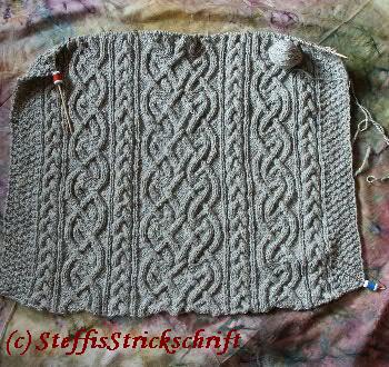 Hier seht ihr mal ein Fortschrittsbild vom St. Bridgid. Wächst zur Zeit sehr langsam, weil mein kleines Spinnrad viiiiiel verlockender drein schauen kann als eine Zopfnadel...