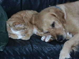 Eigentlich liegt das Pärchen sonst immer andersrum, aber so ging es auch. Nur, daß der Kater partout nicht aufhören wollte Leo zu putzen...